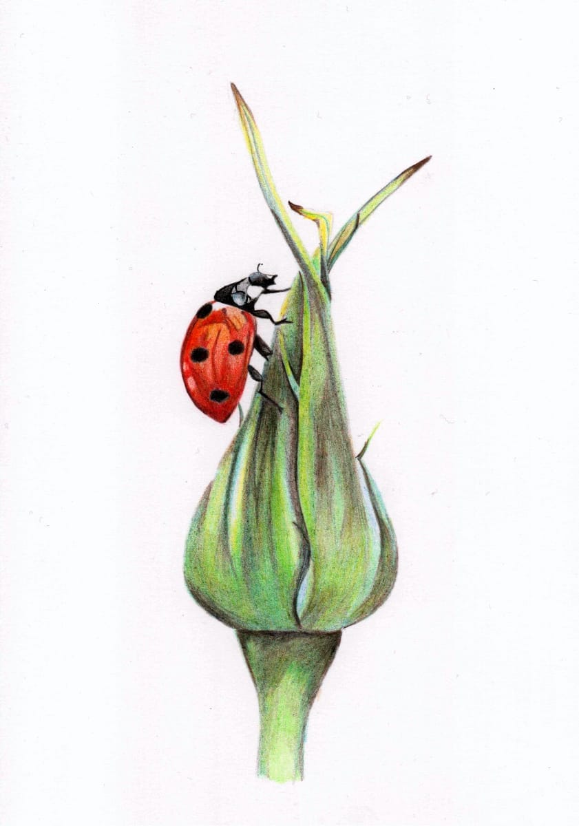 The original drawing was meticulously rendered using Faber-Castell Polychromos coloured pencils on smooth, 250gsm Bristol board, bringing every tiny detail of the ladybird's shell and the soft texture of the rose bud to life.